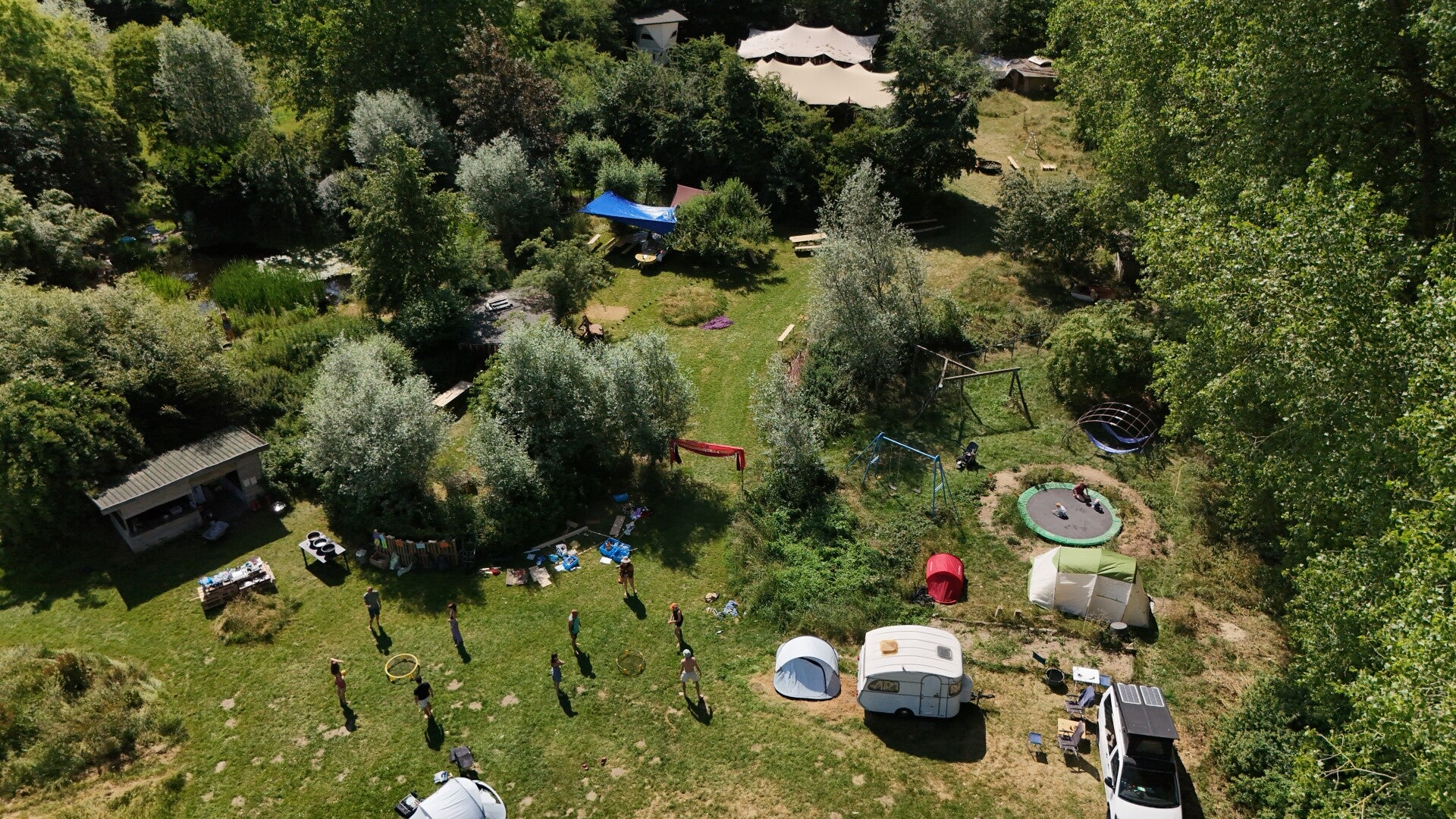 This year we will return to the beautiful ecological community De Vlierhof, just over the border close to Nijmegen. A residential community surrounded by a large green area that clearly has a lot of love and attention put into it. A playground (with trampoline!), swimming pond with sauna, a labyrinth, countless seating areas hidden by greenery, a beautiful large camping field, oh yes and did we already mention: a PLAYGROUND?
